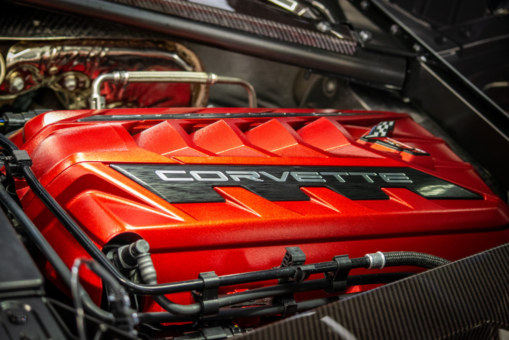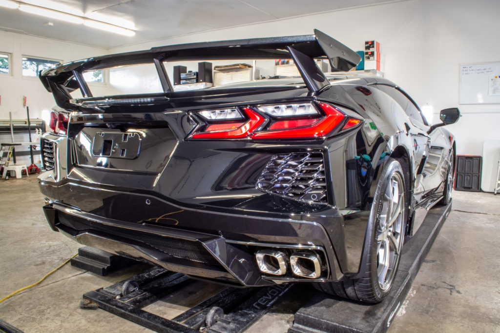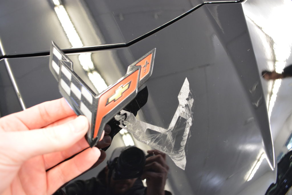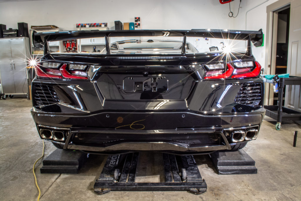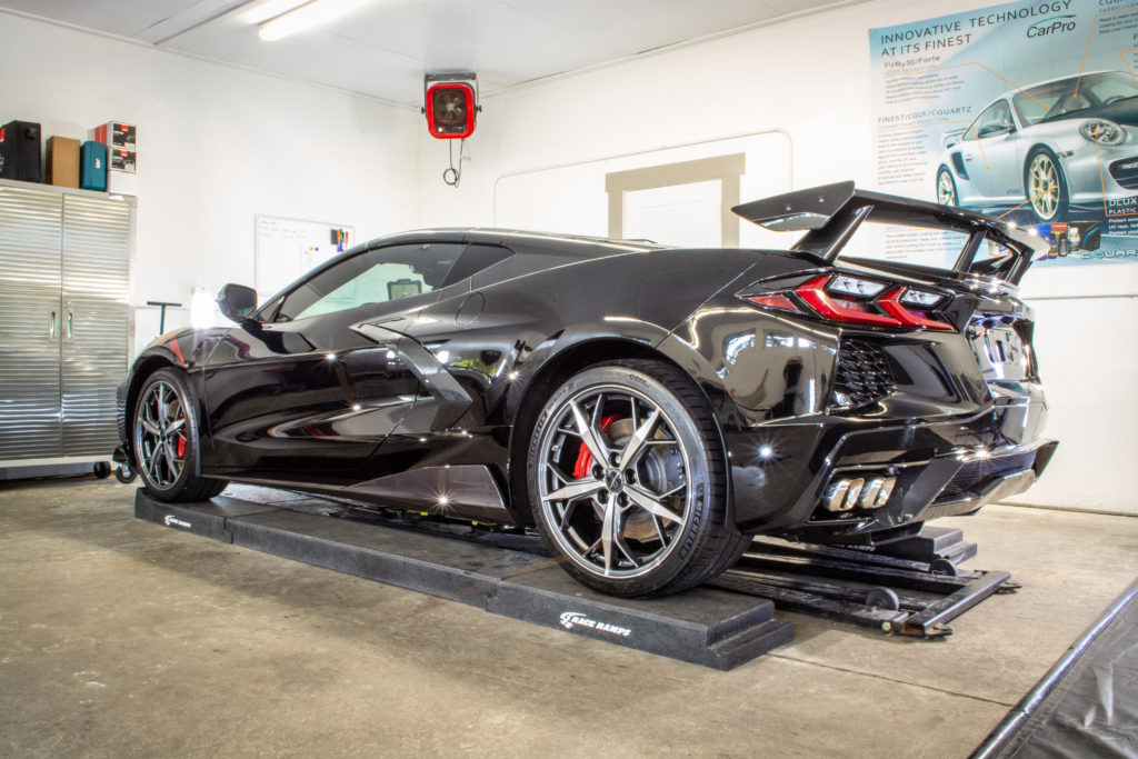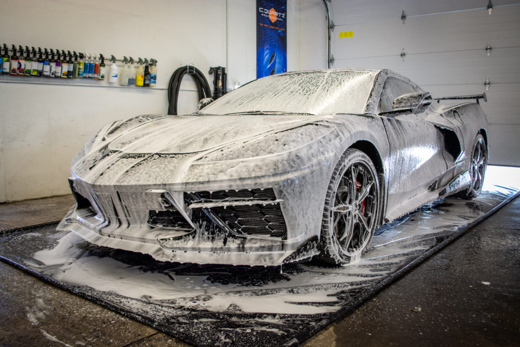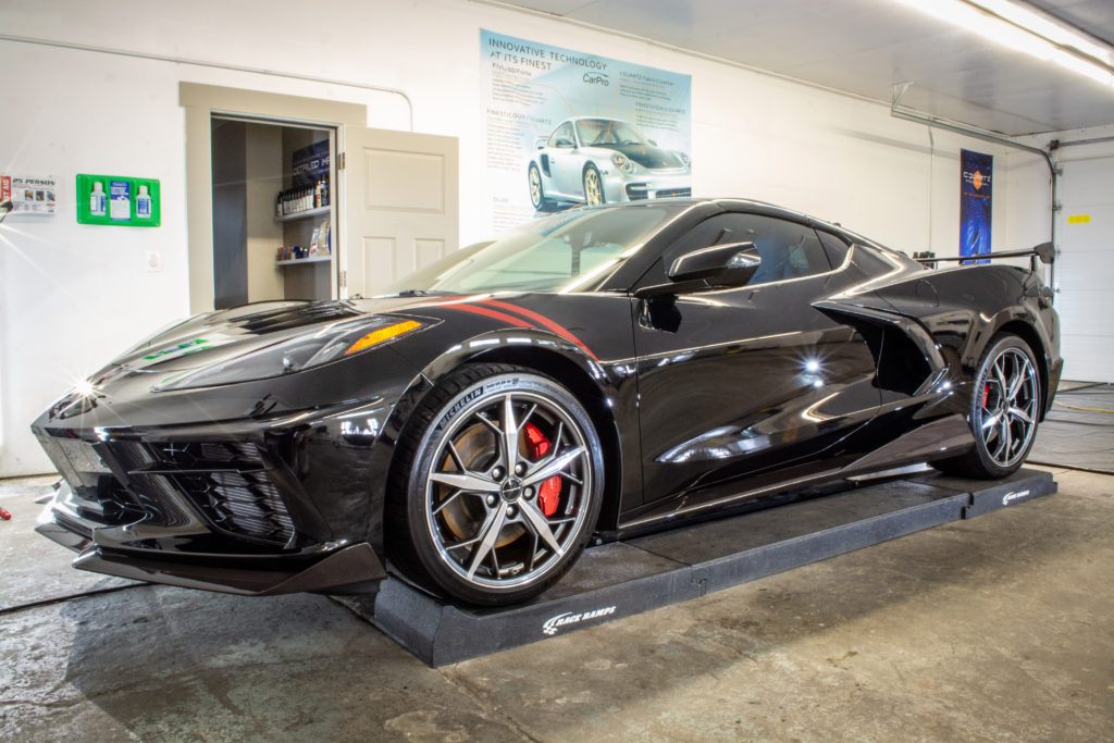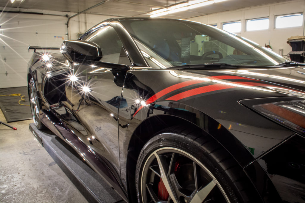 2020 C8 Corvette after our CQuartz Finest Reserve Ceramic Coating TreatmentThe most critical step in any of our premium detailing treatments is a proper “two-bucket-method” hand wash to gently rid exterior surfaces of dirt and grime. Paintwork is then chemically and mechanically decontaminated to safely and fully strip the surface of any bonded contaminates that would otherwise not be removed by washing alone.Once the vehicle has been washed, decontaminated, and thoroughly dried we inspect the various exterior surfaces for damage. The front bumper on this Corvette had particularly severe scratches and marring from debris that had been logged under the shipping wrap while the vehicle traveled from the factory to the dealership.This vehicle encountered inclement weather on its journey from the factory. An excessive amount of a fine, powdery, sand-like material was found in the jambs and is likely what contaminated the underside of the shipping wrap which caused so much damage to the exterior high-gloss paintwork.The sharp and distinct body lines of this C8 Corvette seemed to attract most of the damage from the shipping wrap…Our paint inspection also revealed several factory de-nibbing sanding marks which will require extra attention.Damage on both a-pillars…Some areas of the paintwork were agitated so much by the contaminated shipping wrap they looked completely dull, as if they’d been sanded down.Literally every edge.The owner of this particular Corvette decided it will be best to remove all exterior badges to avoid the troubles of caring for such intricate details amidst the sensitive black paintwork. This also eliminates the annoyance of fibers from your wash mitt catching on the emblems.Badge removal is completed by warming the adhesive backing and cutting through the material with a heavy gauge fishing line. Remaining adhesive is chemically dissolved from the surface.Etched mineral deposits had affected various plastic trims within the engine bay and front trunk jambs. These were removed with CarPro Spotless, an acid-based chemical cleaner formulated to remove water spots and mineral stains from a variety of automotive surfaces. Available in stock in our shop in Newberg or online direct from CarPro at https://www.carpro-us.comUnfortunately our chemical treatments had no effect on the etched water spots found on the inside of the engine bay’s glass windows…Machine polishing fully removed the mineral stains and produced a crystal clear surface.Multi-stage paint correction is a time-intensive process. Various machine polishers, techniques, pads, and abrasive liquids are employed to restore each panel to its fullest achievable degree of perfection.The final results after 20+ hours of machine polishing are quite impressive.The owner of this C8 provided us with their set of Reverse Logic lug guide tools to aid in the safe removal and re-installation of the wheels. These are very high quality and finely machined tools that I would recommend to any C8 Corvette owner that intends on routinely or periodically removing the wheels for maintenance. Available at https://reverselogic.us